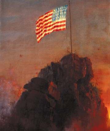 While he is best known for his diverse landscapes, Church also created patriotic works. His Our Banner in the Sky (c. 1861), depicts the famous American flag of Fort Sumter as part of a twilight scene, the colors blending with the sunset. The cover painting of this volume, Our Flag (1864) features the 31-star flag of the Union rising above the smoke of a battle. Describe what you see in the painting, concentrating on the placement of the flag and its relation to the rest. What message does the painting convey? What mood does it evoke? According to the painting, how solid is the Union? How well will it fare?