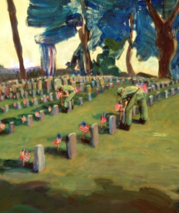 What is the overall mood of the painting? Look carefully at the details of the soldiers, their deeds, and the positions of the flags: How do these details contribute to the overall effect? Why does White draw our attention to the trees among the grave markers? What does the yellow sky in the background add to the feeling? How well does this image capture the spirit and meaning of Memorial Day?